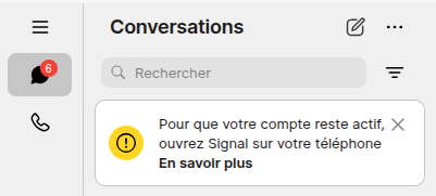 Le tuto n'est pas fini ! Au bout d'un mois ou deux, le message suivant va apparaître sur ton compte signal : "Pour que votre compte reste actif, ouvrez Signal sur votre téléphone".